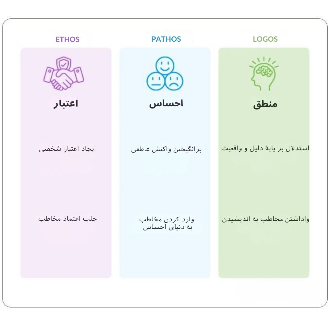 وقتی ارسطو از مثلث متقاعدسازی صحبت کرد، سه ضلع برای آن تعریف کرد: Pathos (احساسات) که قلب مخاطب را هدف میگیرد، Logos (منطق) که با عقل و استدلال او سخن میگوید، و Ethos (اعتبار) که به یک سؤال بنیادین پاسخ میدهد: «چرا باید به تو و حرفهایت اعتماد کنم؟»