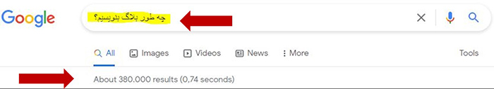 در مثال بالا هم مشاهده میکنید که با هر بار اختصاصیترکردن عبارت کلیدی، حجم نتایج جستوجو بهطور چشمگیری کاهش پیدا میکند. بلاگپست حاضر با کلمۀ کلیدی بلاگنویسی در محدودۀ Fat Head و با 243،000،000 نتیجۀ جستوجو، در رقابتی پایانناپذیر و محکوم به شکست قرار میگیرد.