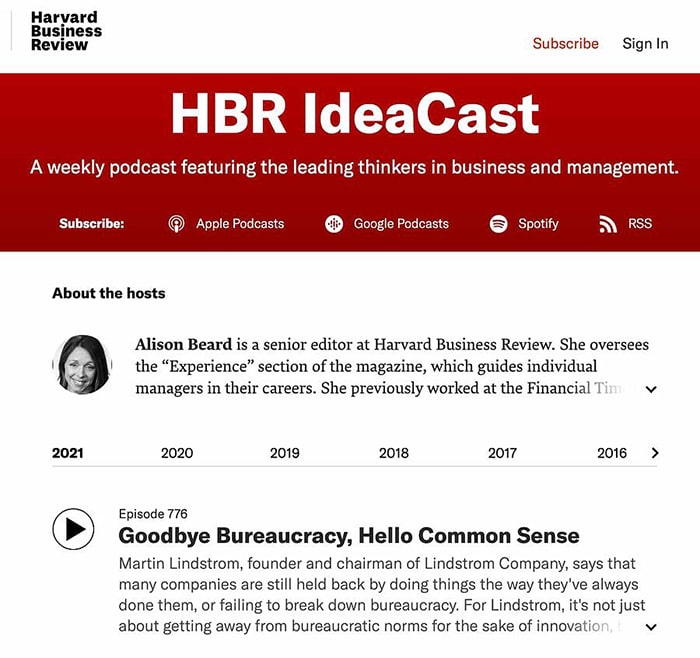 Review (HBR) یک پادکست هفتگی به نام HBR IdeaCast دارد که رهبران صنعت را در کسبوکار و مدیریت نشان میدهد. میتوانید برای دریافت همیشگی صداها در پادکست آنها مشترک شوید، یا اینکه هر زمان تصمیم داشتید به پادکستهای آنها گوش دهید. شما کدام روش را انتخاب میکنید؟