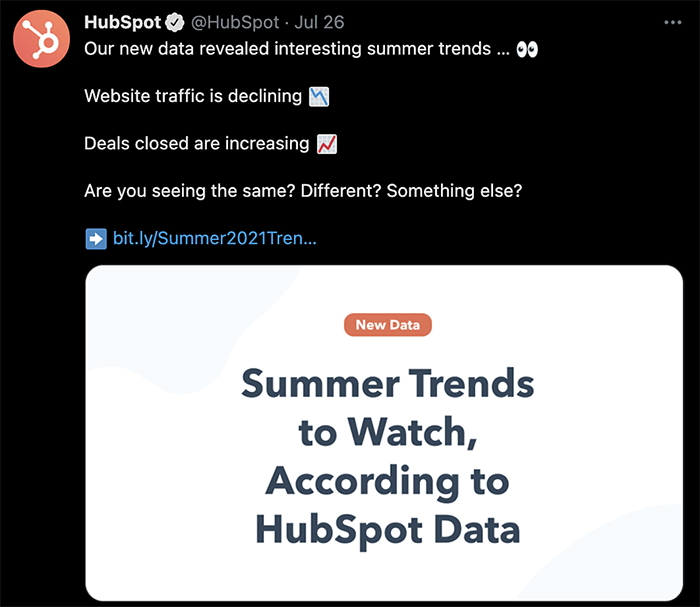 HubSpot از توییتر بهعنوان نرمافزار بازاریابی و همچنین ایجاد جامعهای در بین مشتریان، اعضای مخاطبان هدف، رهبران و کارشناسان صنعت استفاده میکند. HubSpot اطلاعات محصول، نکات مربوطه، دانش صنعت و تحقیقات اصلی را در توییتر به اشتراک میگذارد. HubSpot همچنین با کاربران تعامل دارد و تضمین میکند که هرکسی که به پشتیبانی مشتری نیاز دارد، دقیقاً میداند برای کمک به کجا مراجعه کند.