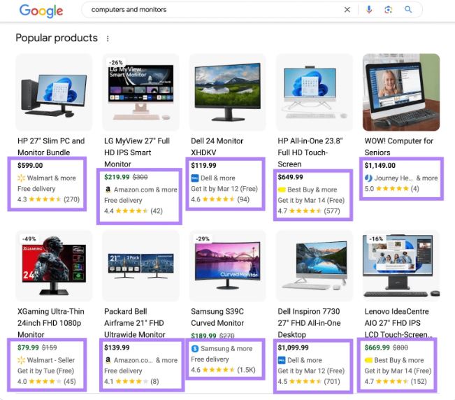 این نتایج جستوجوی بهبودیافته به عنوان ریچ اسنیپت شناخته میشوند. اگر این جزئیات در نتایج جستوجو نمایش داده شوند، کاربران میتوانند اطلاعات ارزشمند را مستقیماً در نتایج جستوجو پیدا کنند. بهعنوان مثال، صفحۀ محصول شرکت دل برای کامپیوترها، مانیتورها و سایر راهکارهای فناوری از نشانهگذاری اسکیما استفاده میکند و گوگل اطلاعاتی مانند بازۀ قیمت، در دسترس بودن محصول، هزینۀ ارسال و موارد دیگر را در نتیجۀ جستوجوی این صفحه نمایش میدهد.