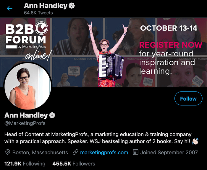 Ann Handley رئیس محتوا در MarketingProfs، نویسنده و سخنرانی پرفروش است. او آموزشهایی را درزمینۀ بازاریابی ارائه میدهد که کسبوکارها میتوانند از آن بیاموزند و از آنها استفاده کنند. بهعلاوه، آموزشهای حضوری و مجازی را برای شرکتها درزمینۀ بازاریابی محتوایی، داستانسرایی، تولید سرنخ و برندسازی ارائه میدهد. همۀ این موضوعات، مواردی هستند که او دربارۀ آنها در صفحۀ توییتر خود صحبت میکند و آنها را به اشتراک میگذارد.