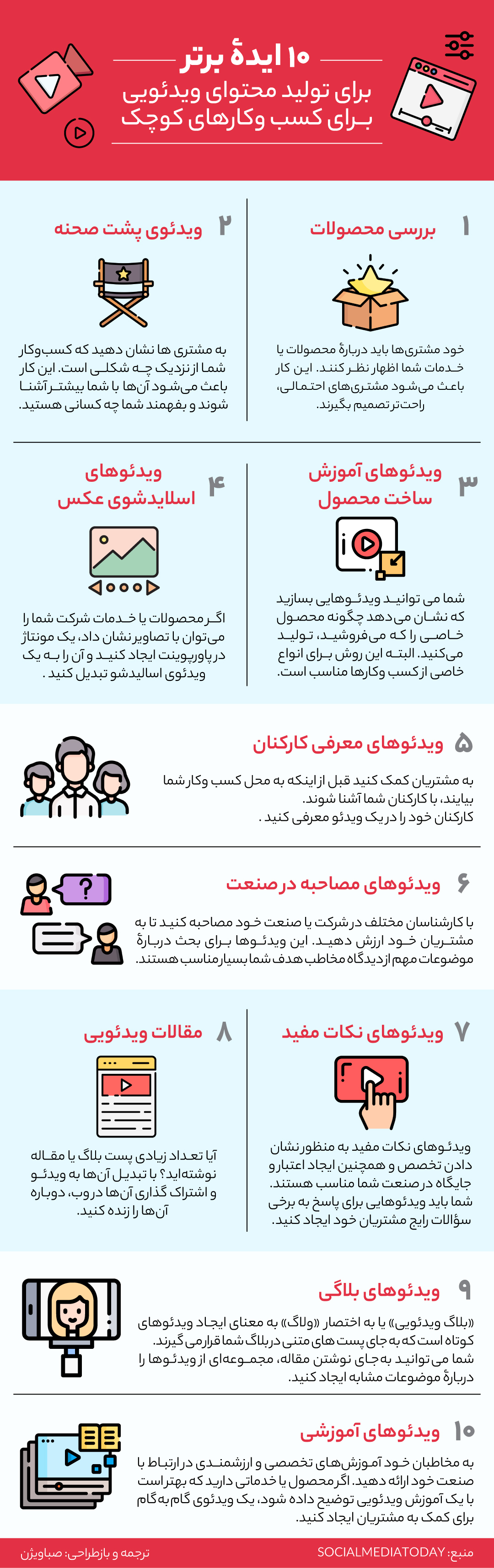 دانلود اینفوگرافیک 10 ایدۀ تولید محتوای ویدئویی برای کسبوکارهای کوچک