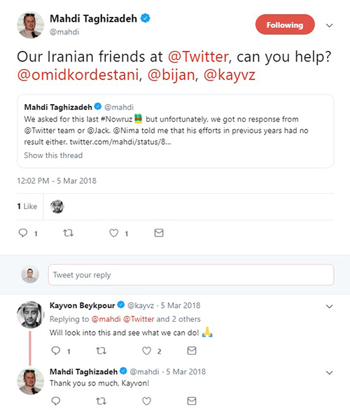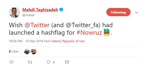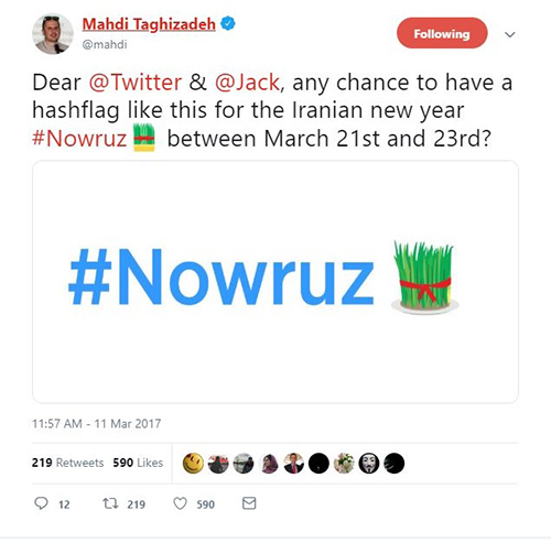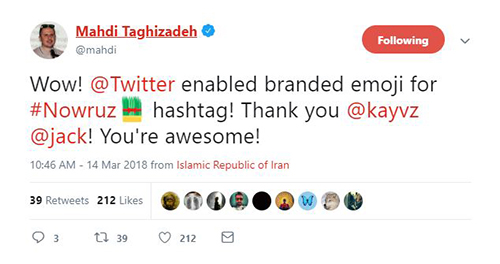 در همین تاریخ نیما اکبرپور نیز در توییتی اعلام کرد: «به توییتر پیشنهاد دادم که برای هشتگ نوروز یک اموجی #هم طراحی کنند، گفتند فرصت کمه و کاش زودتر میگفتی، اما قرار شد یک پیام شادباش توییت کنند.