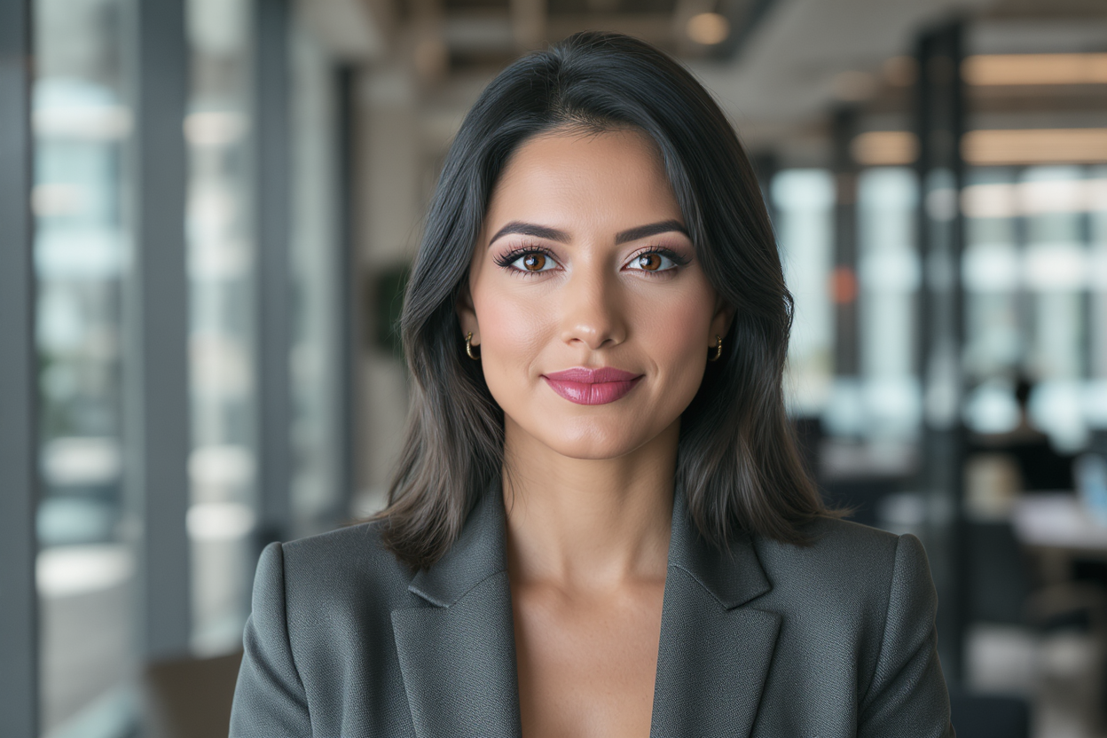 - پرامپت (فارسی): پرترۀ کلوزآپ از یک مدیرعامل زن ۳۵ ساله با موهای تیره، نگاه مصمم، لبخند ملایم، کت و شلوار خاکستری شیک، در یک دفتر کار مدرن با پنجرههای بزرگ، نور طبیعی ملایم، پسزمینۀ کمی محو، سینمایی، فوتورئالیستیک و بسیار دقیق.